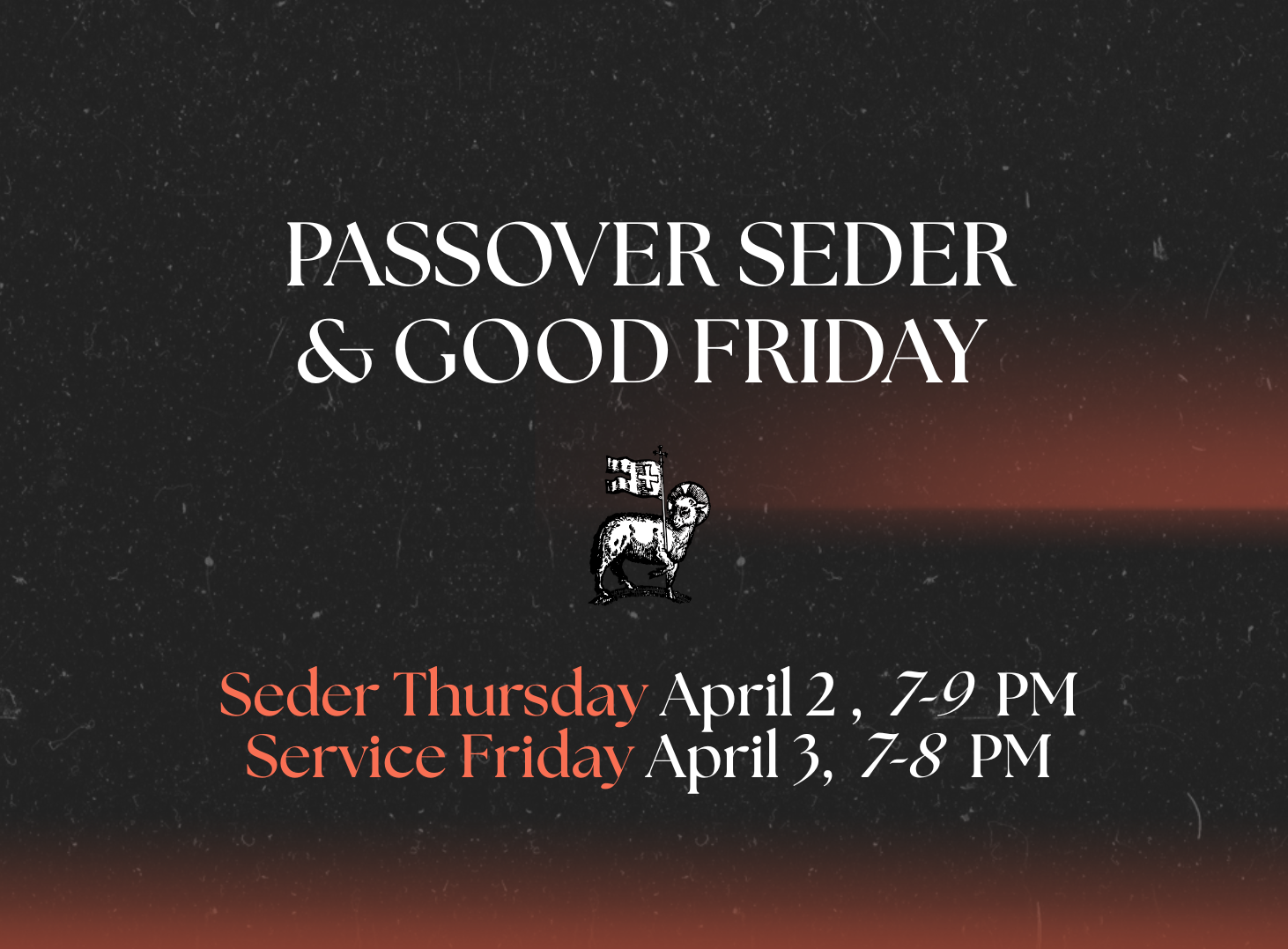 The following night after the Passover Seder come together at our Good Friday service on April 3 from 7-8 PM to meditate on Christ’s self-giving death through worship and scripture. Contact Joe at joe@regenerationweb.com